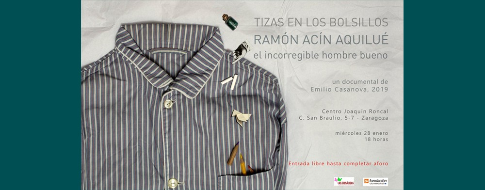 Este próximo miércoles día 28 de enero se proyecta, en el Centro Joaquín Roncal de la CAI -San Braulio 5-7 de Zaragoza, el documental Tizas en los bolsillos. Ramón Acín, el incorregible hombre bueno, dirigido por Emilio Casanova en coproducción con Aragón TV en 2019.